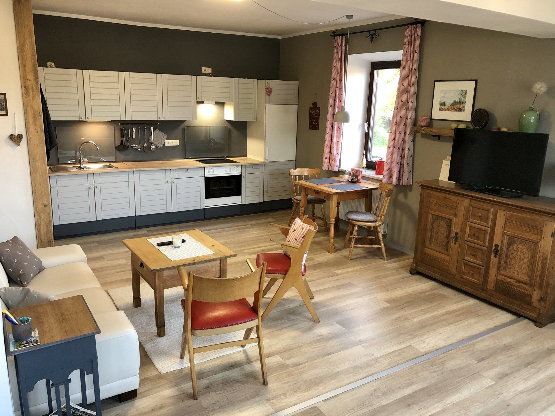 Die Wohnküche ist großzügig geschnitten mit Ess- und separater Leseecke. Zwei große Flachbild TV/Sat im Wohn- und Schlafzimmer, Radio, kostenloses WLAN, Abstellraum.