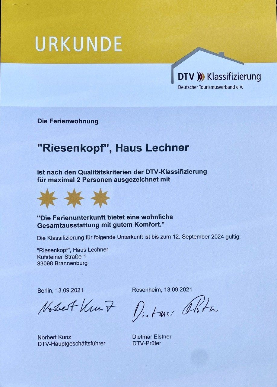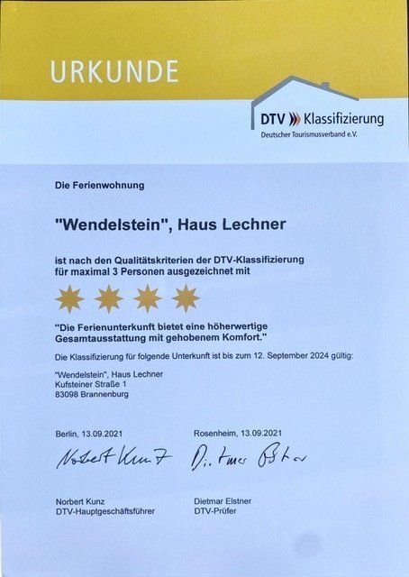 Unsere beiden Ferienwohnungen "Riesenkopf" und "Wendelstein" wurden mit *** und **** nach den Qualitätskriterien der DTV-Klassifizierung ausgezeichnet und bieten Ihnen guten bzw. gehobenen Komfort.